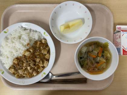 牛乳 マーボー豆腐丼 春雨スープ りんご