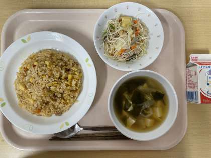 牛乳 キムチチャーハン 炒めビーフン わかめスープ