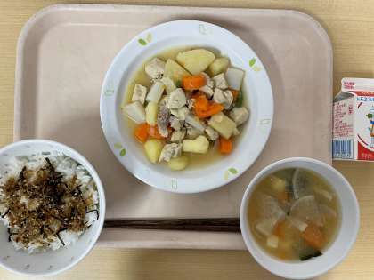 牛乳 ごはん かみかみふりかけ 塩肉じゃが 大根の味噌汁