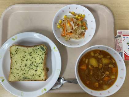 牛乳 ガーリックトースト ポークビーンズ かみかみサラダ
