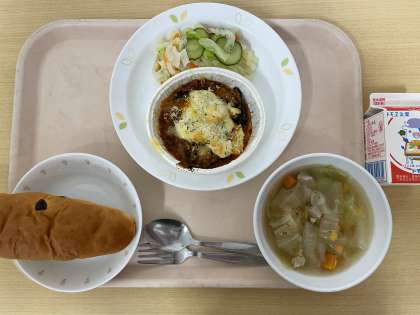 牛乳 ぶどうパン ムサカ フレンチサラダ レンズ豆のスープ