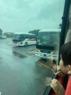 赤城高原サービスエリアに到着、2回目の休憩を済ませました。雨が降ったり止んだりしています。バスに酔ってしまった子供もいますが、みんな元気で、川場到着を心待ちにしています。