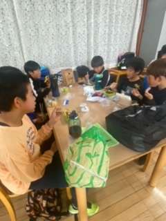 クラスの集合写真を撮ったあと、地面がぬれているため、食堂で昼食タイムです。