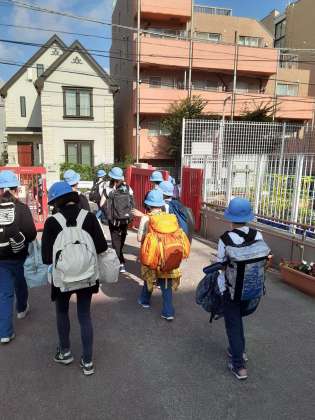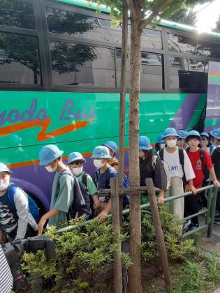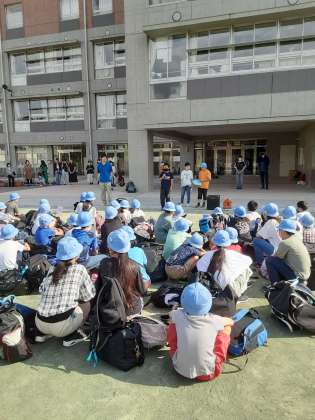 5年1・2組の子供たち、校庭で出発式を行って元気いっぱいに出発しました。