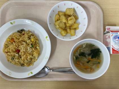 牛乳 ジャンバラヤ スパイシーポテト 野菜のスープ