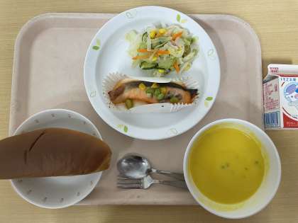 牛乳 黒砂糖パン 魚のレモン焼き コーンサラダ かのちゃポタージュ