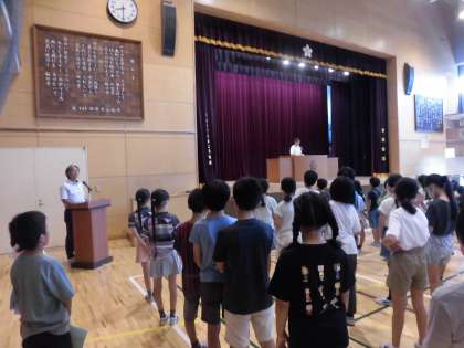 体育館で終業式を行いました。1年生と4年生の代表児童が1学期に頑張ったことを振り返りました。みんな1学期最終日にふさわしい立派な態度でした。