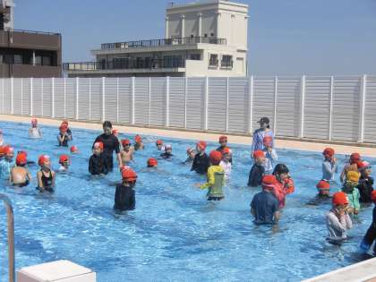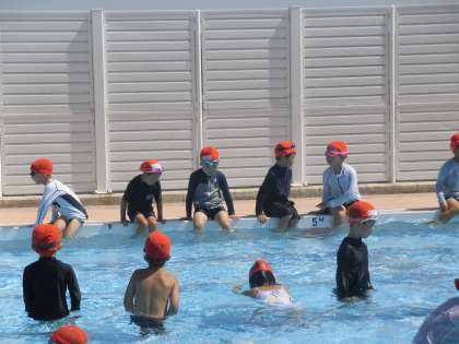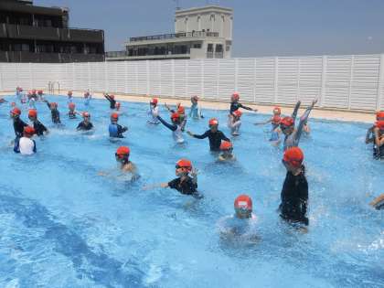 今日の夏季水泳教室は、前半が1年生、後半が2年生でした。青い空の下、楽しそうに活動していました。