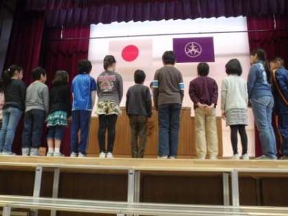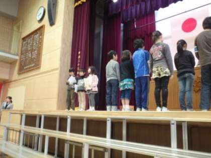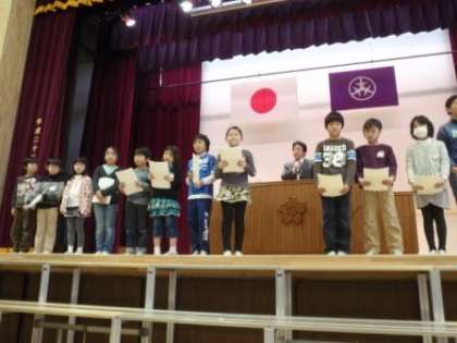(写真は、修了証を授与されているところです。各クラスの代表者がクラスの分の修了証を校長から手渡されます。)