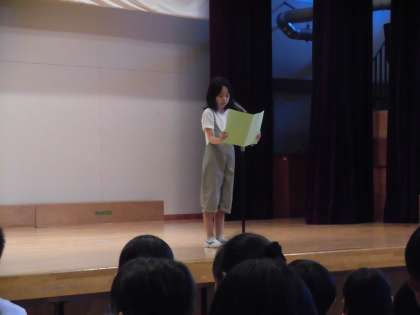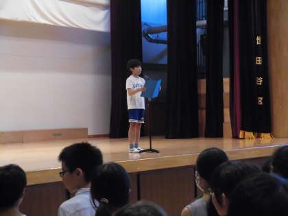 夏休みが終わり、元気な子供たちが学校に戻ってきました。転入生を4名迎え、705名で2学期をスタートしました。始業式では、3年生と5年生の代表児童が、2学期に頑張りたいことを発表しました。