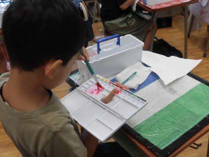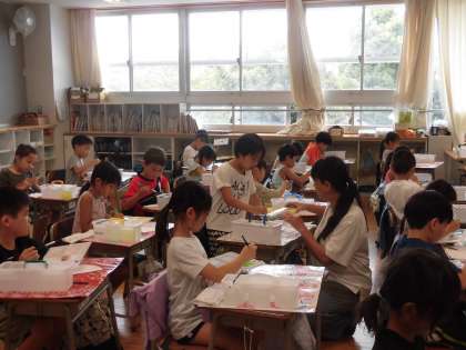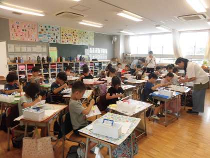 1年生が図工の時間、初めて絵の具を使いました。みんな集中して、パレットの上で絵の具と水の量を調節していました。今日は、「おいしいジュースを作ろう!」とコップの形に切った画用紙に、自分の好きな色を塗って完成させていました。