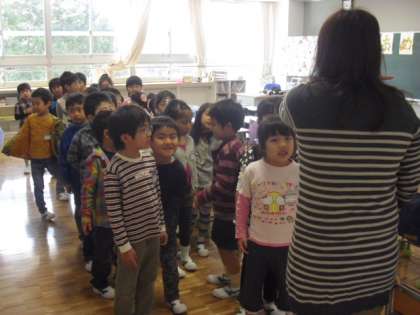 2組は、名前の順番に並ぶ練習。担任が名前を呼ぶとみんな「ハイ!」と元気な返事ができました。