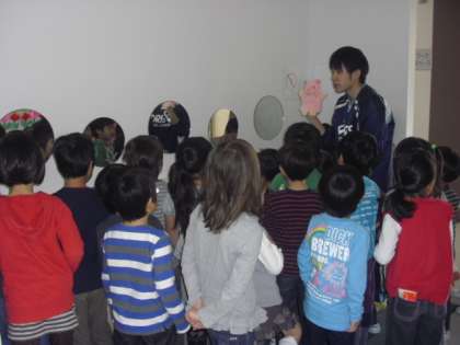 3組は、水飲み場の使い方をお勉強。担任がマペットを使って楽しく指導しています。