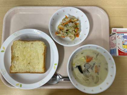 牛乳 ガーリックパン パンプキンシチュー ツナと枝豆のサラダ