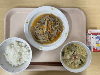 牛乳 ごはん 麻婆春雨 にら玉スープ