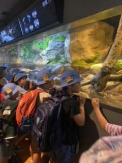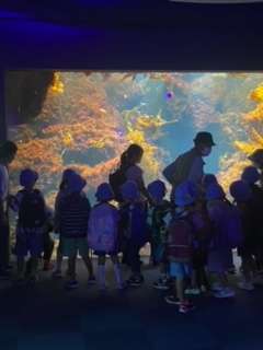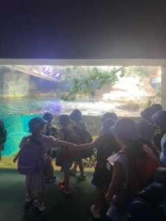海の生き物たちに大興奮しています。きれいな色をした魚に大喜びです。