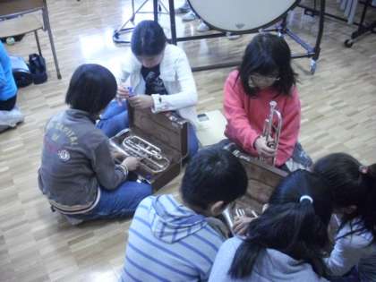 今日は、新入部員に上級生が楽器の取り扱いやしまい方を優しく丁寧に教えてくれています。優しく丁寧に下級生に接する姿に、きっとこの子の奏でる音楽も優しく丁寧な音がするんだろうなと感じました。