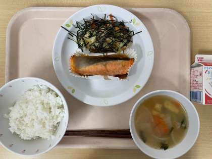 ごはん 魚の醤油バター焼き 梅のりあえ 呉汁