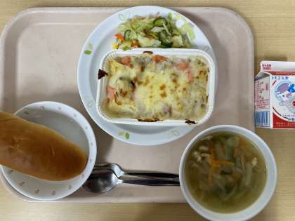 牛乳 ミルクパン きのこグラタン コーンサラダ 野菜スープ