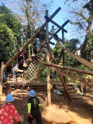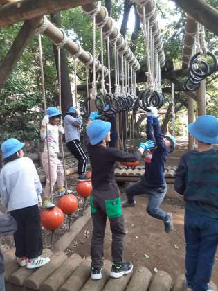 3年生、フィールドアスレチック横浜つくし野コースに到着して遊び始めました。まずは、ファーストステージとファイナルステージに挑戦しています。他に団体がいないので桜小が貸し切り状態です。
