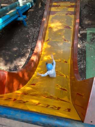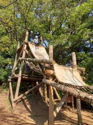 3年生、元気いっぱいに楽しんでいます。フリーフォールすべり台。子供たちはすべる前は「こわいなあ。」と言っていますが、勇気をもってすべると、「楽しい!」となり、何度もすべっています。
