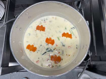 調理員さんがにんじんで「コウモリ」を型抜いてシチューを飾りつけてくれました。子供たちは大興奮で喜んでくれていました。