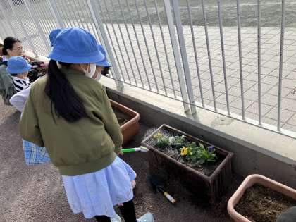 今回、植えた花は春に咲きます。3月の6年生が卒業式や、4月の新1年生の入学式を彩ります。責任重大な2年生!頑張って、お世話します。