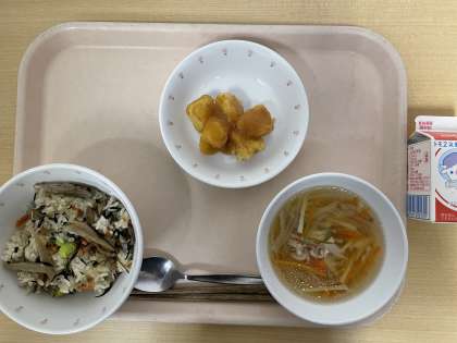 今日は埼玉県の郷土料理である「かて飯」がでます。昔はお米が貴重だったので、お米の代わりに野菜などを加えた混ぜご飯にしていました。そのため「加える」という意味の「糧」をつけて「かて飯」と名付けられたそうです。「みそポテト」はB級グルメで有名になった秩父地方の名物料理です。