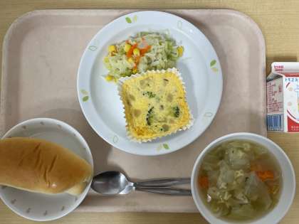 牛乳 ミルクパン キッシュ風オムレツ コールスローサラダ ABCスープ