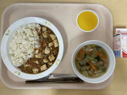 牛乳 麻婆豆腐丼 春雨スープ ピーチ杏仁豆腐