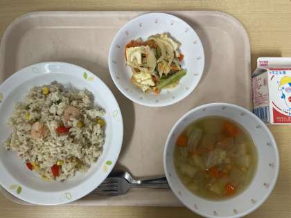 「ナシゴレン」と「ガドガドサラダ」はインドネシア発祥の料理です。「ナシゴレン」は豚ひき肉やコーン、ピーマン、えびなどが入ったチャーハンのような料理です。「ガドガドサラダ」は本当はピーナッツソースをかけて食べるインドネシアの料理ですが、給食では「ごま」を使いました。