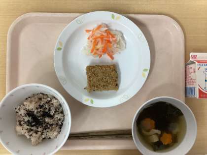 牛乳 赤飯 松風焼き 紅白なます すまし汁