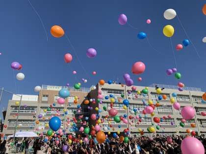 第二部は、開校145周年をお祝いして「バルーンリリース」を行いました。桜の子供たち一人一人の夢と希望が詰まった風船です。空高く風船が飛んでいく様子を最後まで見届けました。