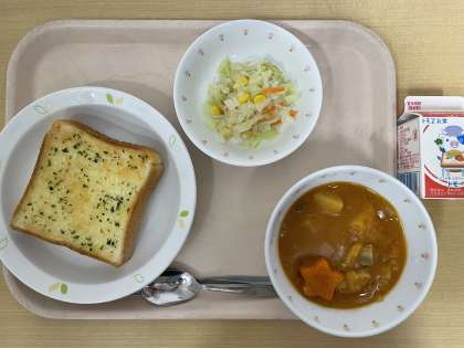 牛乳 ガーリックトースト チキンブラウンシチュー コールスローサラダ
