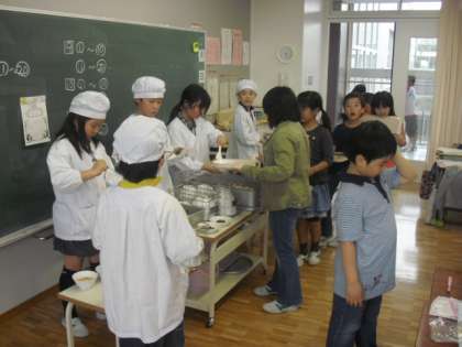 子どもたちは、力をあわせ、時間を取りもどすようにせっせせっせと給食当番の仕事に取り組みます。