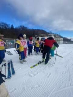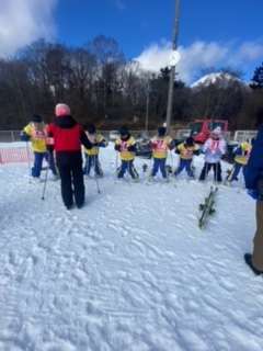 午前中は、初級のグループは、ブーツを履いて雪の上を歩き、慣れてきたら板をつけて雪の上を歩く練習からスタート。中級、上級のグループは早速滑り始めました。