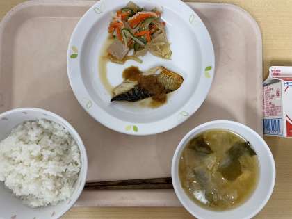 牛乳 ごはん 魚のおろしポン酢がけ こんにゃくサラダ 油揚げの味噌汁