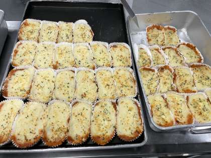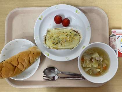 今日は、イギリスの「コテージパイ」という料理を出します。本来はミートソースに牛肉を使いますが、給食では豚肉を使って作りました。ミートソースの上に、じゃが芋を潰したマッシュポテトをのせて焼きます。ぜひ食べてください。
