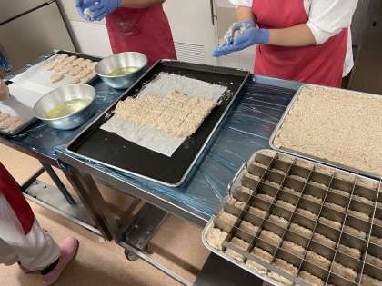 「つくね」は、お肉に卵やパン粉を加えてよく混ぜ合わせ、団子や棒状にして焼いた料理です。給食では、鶏肉のほかに、豆腐も加えています。たくさんの量を混ぜるのは大変ですが、よく混ぜて一つ一つ丸めてくれています。1、2年生は1個ですが、3年生になると2個食べることができます🎵