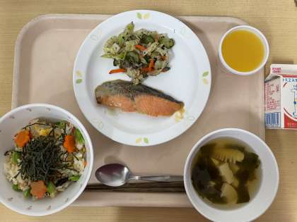 牛乳 ちらし寿司 魚の西京焼き 野菜のゆかりかけ 竹の子のすまし汁 ももゼリー