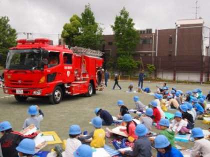 朝から天候が心配されましたが、なんとかもちこたえ消防写生会を行うことができました。校庭に大きい真っ赤な消防車が到着すると「わぁ大きい!!」と歓声があがりました。間近に消防車を見て、細かい所まで気を配りながら作品を完成させることができました。