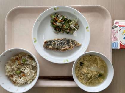 牛乳 かやくご飯 魚の竜田揚げ 野菜のゆかりかけ かきたま汁