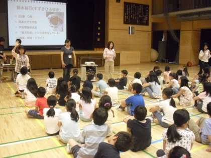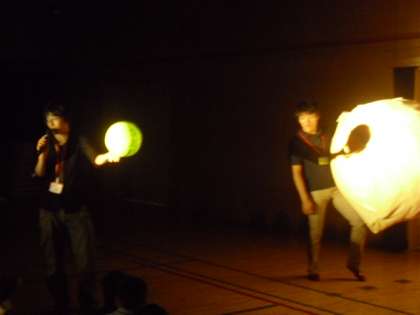 「月の表面の模様が何に見えるか考えてみよう!」という課題に取り組んだり、体育館を真っ暗にして、投光器を用いて1メートルほどのバルーンとソフトバレーボールに光を当て、再現された日食を観察をしたりと子ども達にとって有意義な活動を提供していただきました。