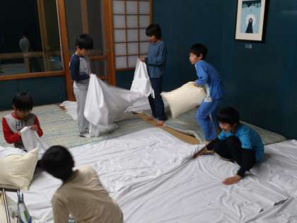 友達と協力しふとんを敷いたり、シーツをひろげたり!