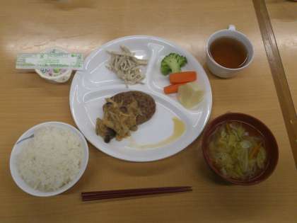 2日目の夕食は、ご飯、味噌汁、和風ハンバーグ、温野菜、ごぼうサラダ、うめゼリーです。
