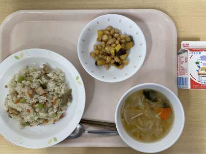 牛乳 鶏肉とごぼうのごはん 油揚げと大根の味噌汁 お豆かりんとう