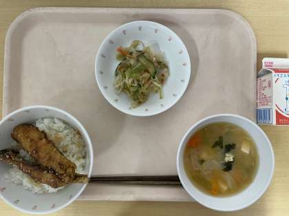 牛乳 いわしの蒲焼き丼 玉ねぎと豆腐の味噌汁 梅ドレサラダ