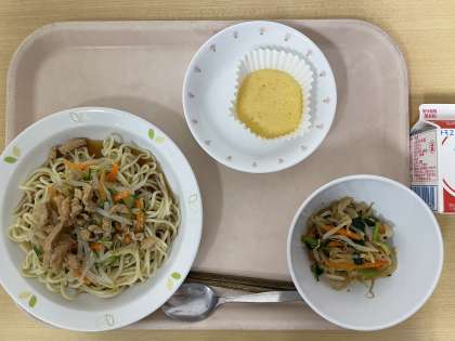 むしむしと暑い日でも「冷やし中華」はするすると入るのではないでしょうか?「冷やし中華」は麺を茹でて冷まし、野菜を切って茹でて冷まし、汁をつくって冷ましと給食メニューの中では忙しい1品です・調理員さんはみなさんに美味しく食べてもらえるように愛情たっぷり、今日も一生懸命つくってくださいました。
