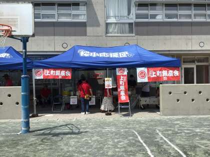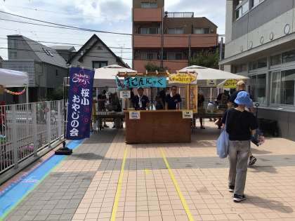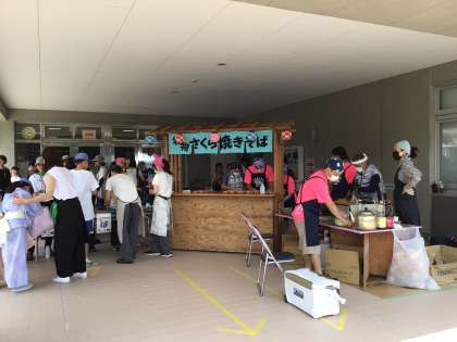 「焼きそば」「玉こんにゃく」「チョコバナナ」「ポップコーン」です。みんな、おいしそうに食べています。
