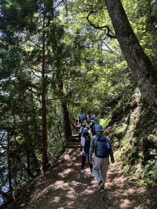 左に湯ノ湖を眺めながら、頑張って歩いています。